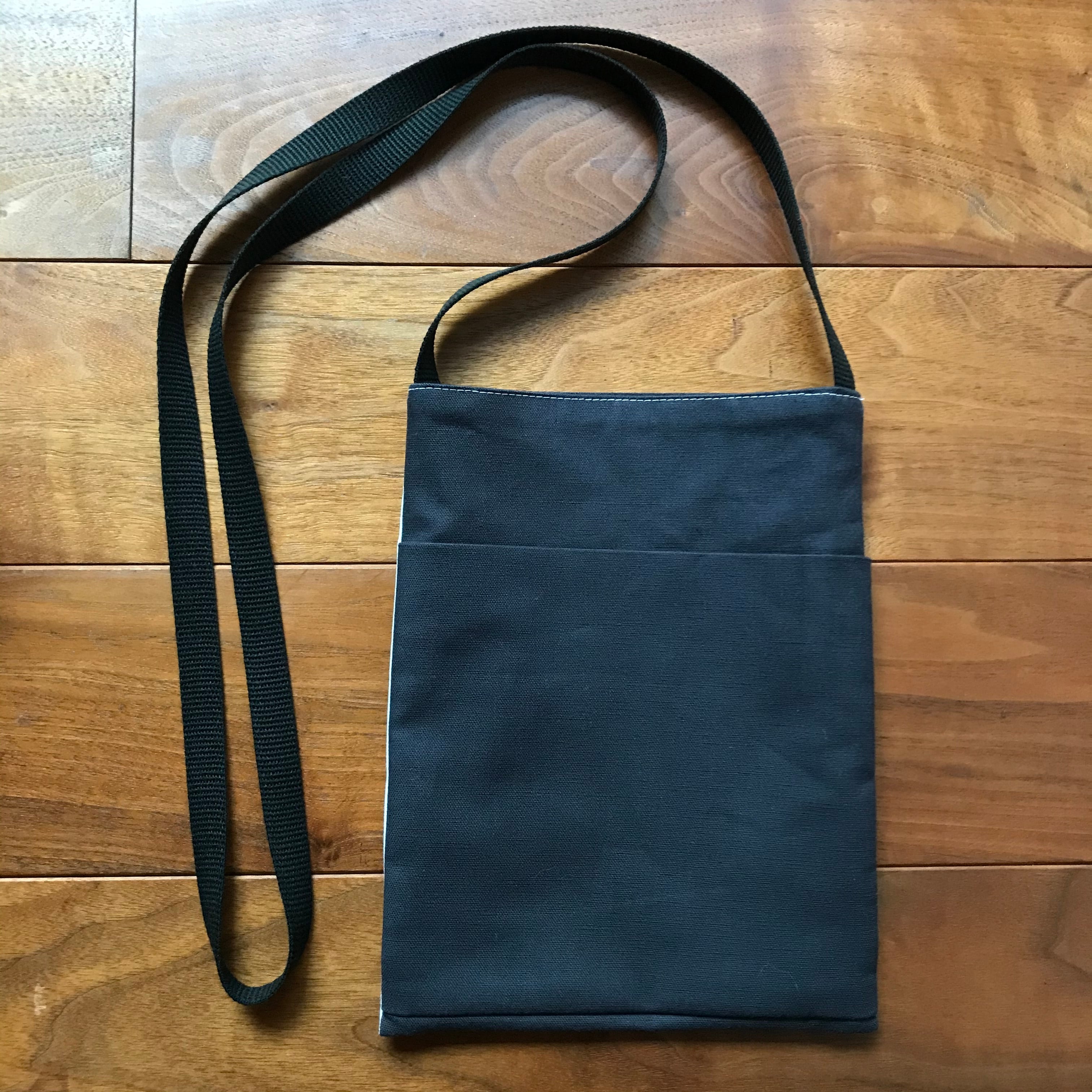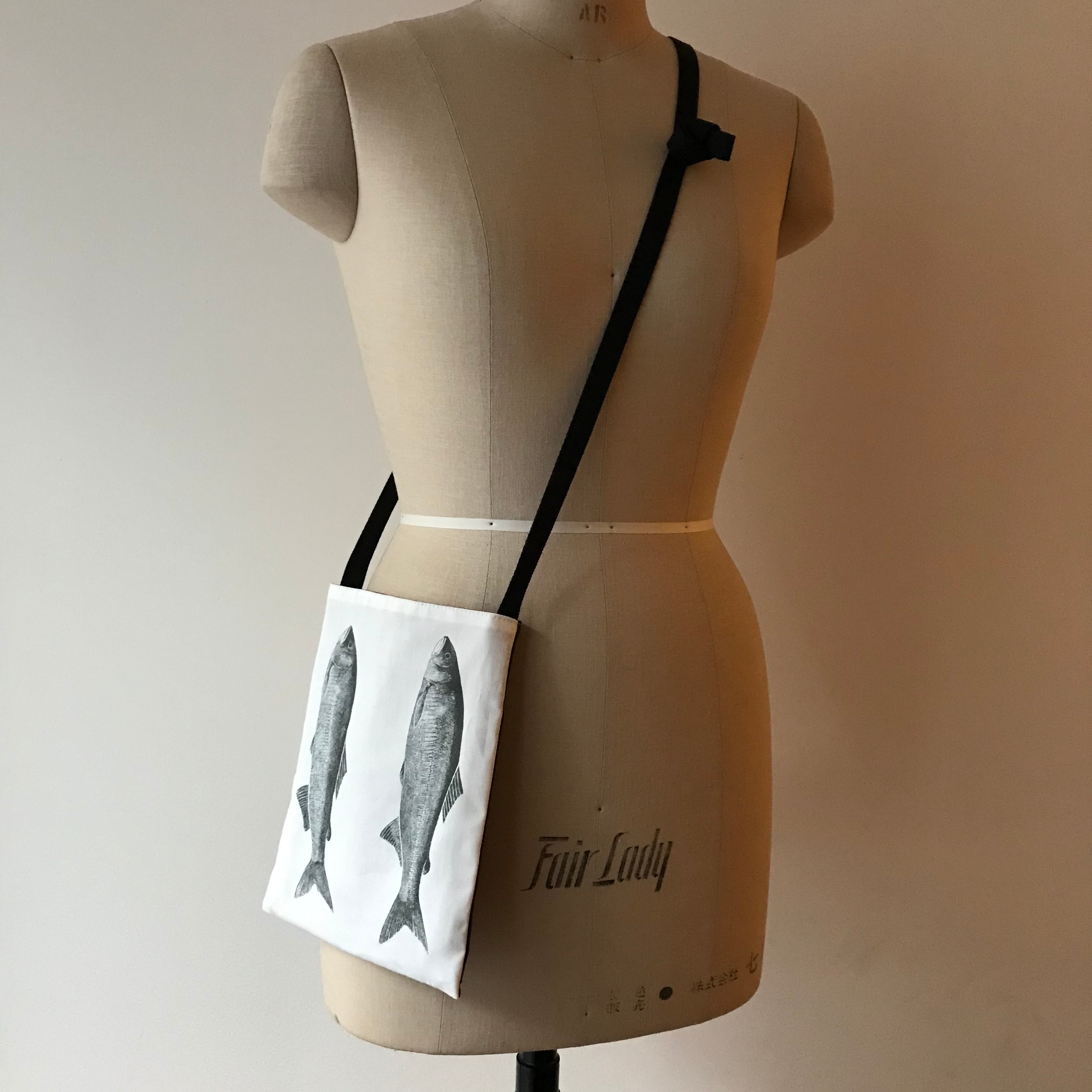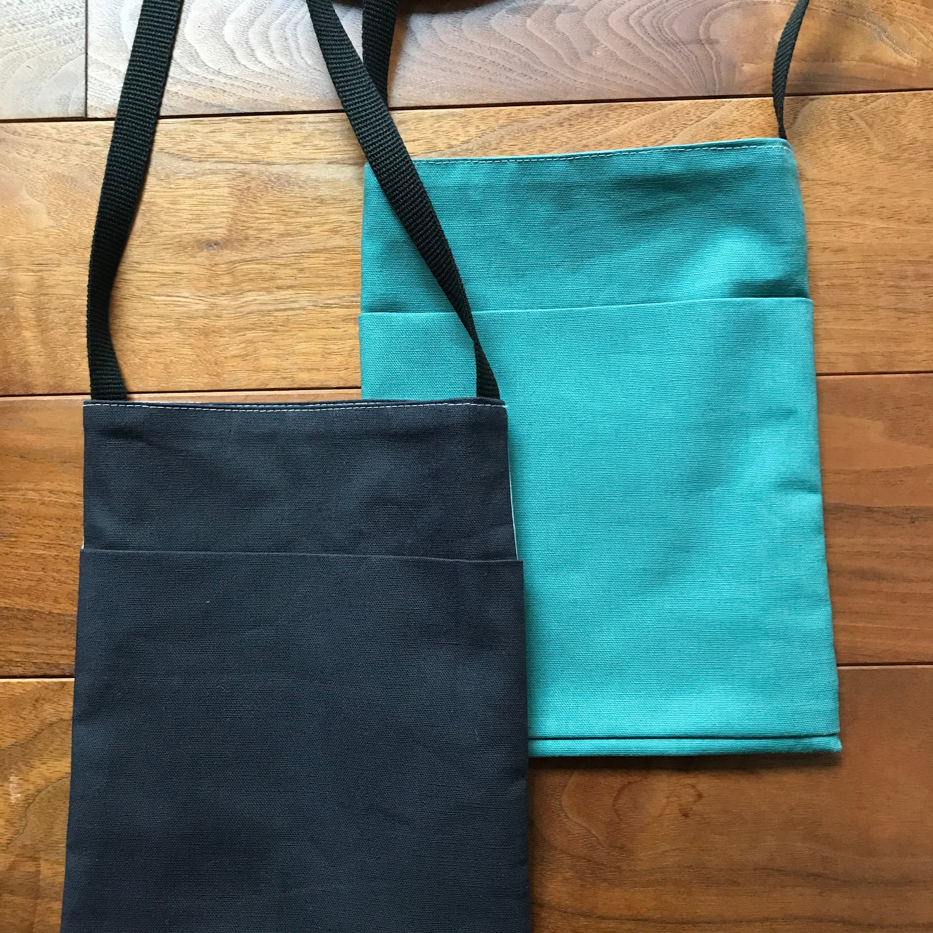 表面はつがいの鮎、裏面と内布は無地で2色ございます。背面にポケットが付いていて便利です。ちょっとしたお出かけにいかがでしょう。ヒモが長い場合は、ちょいと結んで使って下さいね。