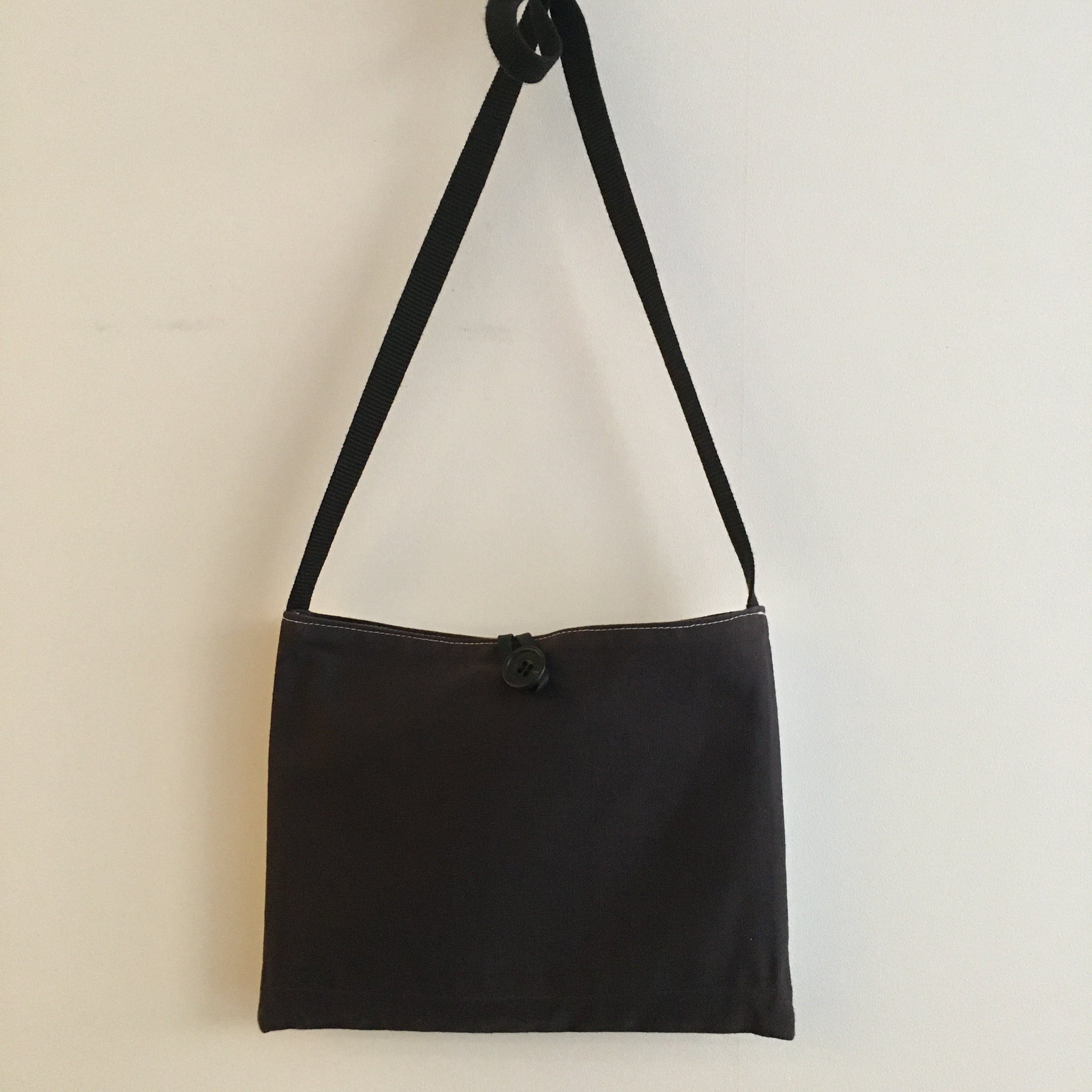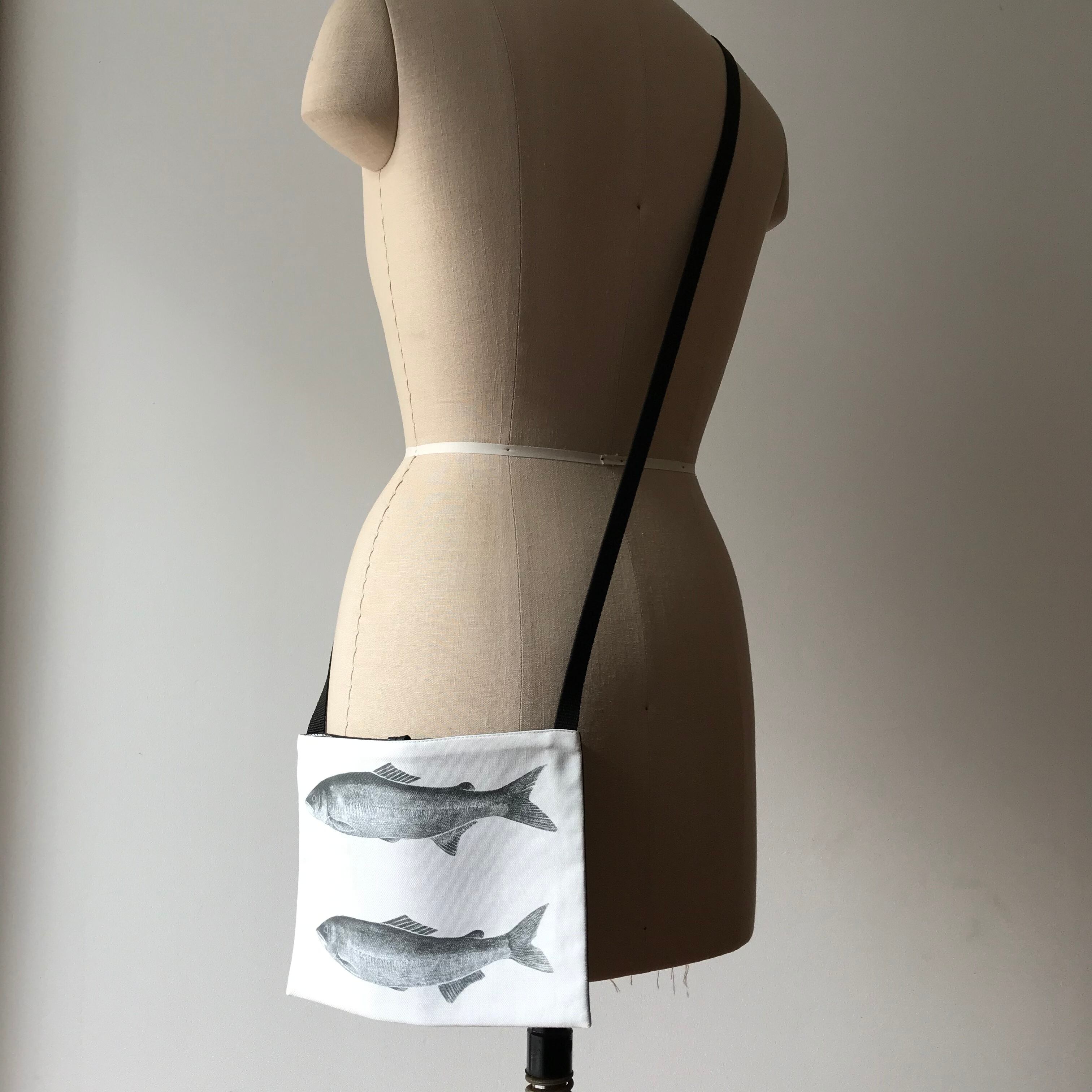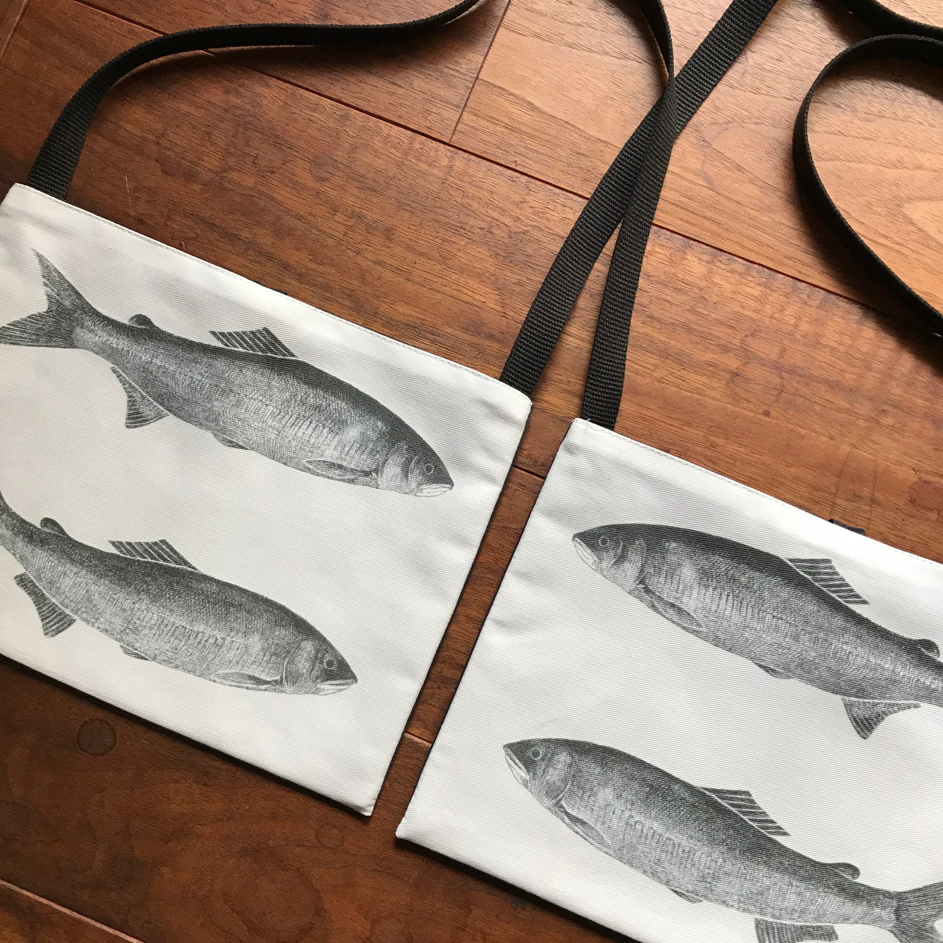 表面はつがいの鮎、背面と内布は無地で4色ございます。背面にはボタンが付いていて、口がぱっくり開いてしまうのを防ぎます。洋服にも和服にもなぜかしっくりくるデザイン。ちょっとしたお出かけにいかがでしょう?ヒモが長い場合は、ちょいと結んで使って下さいね。