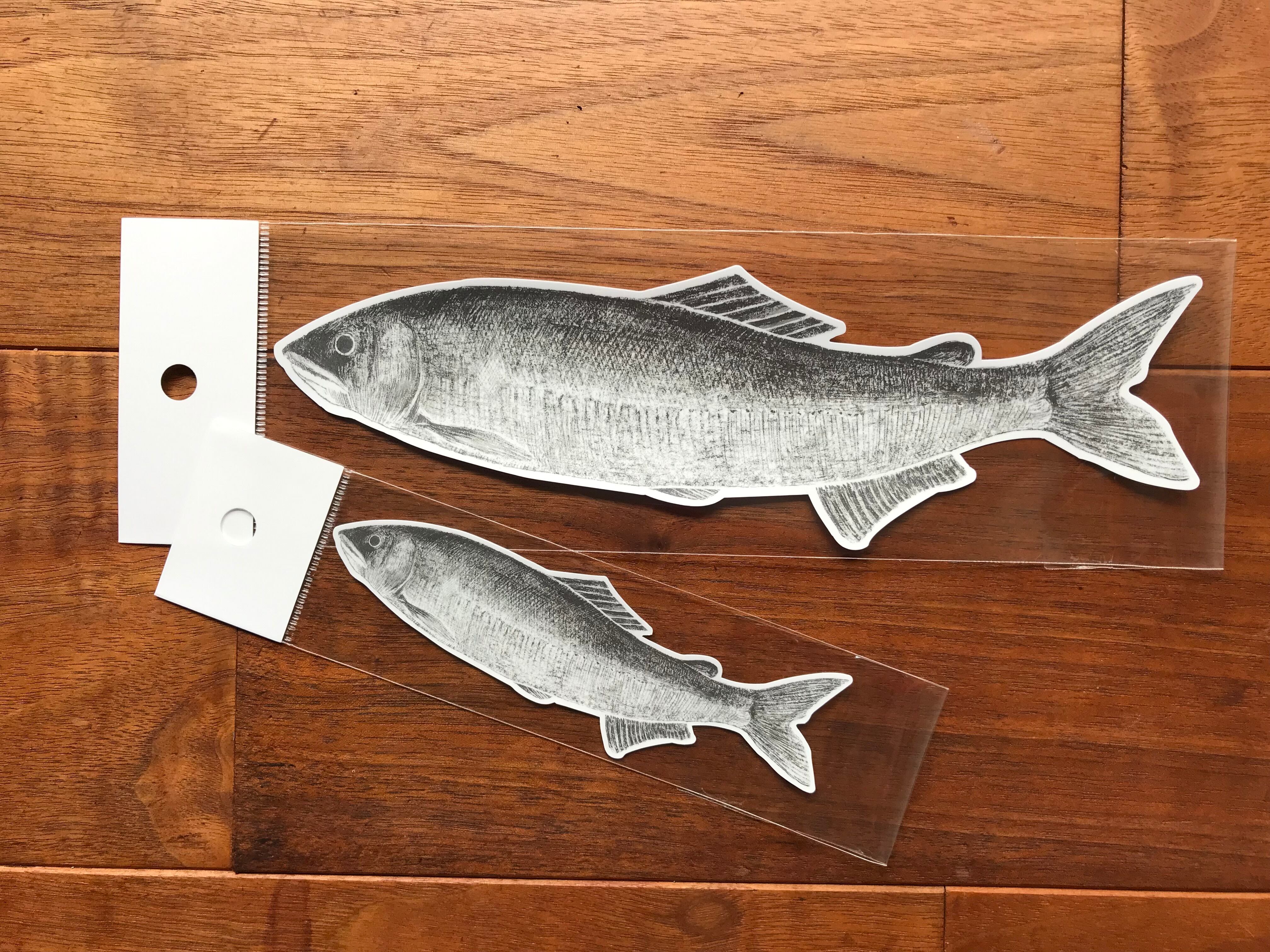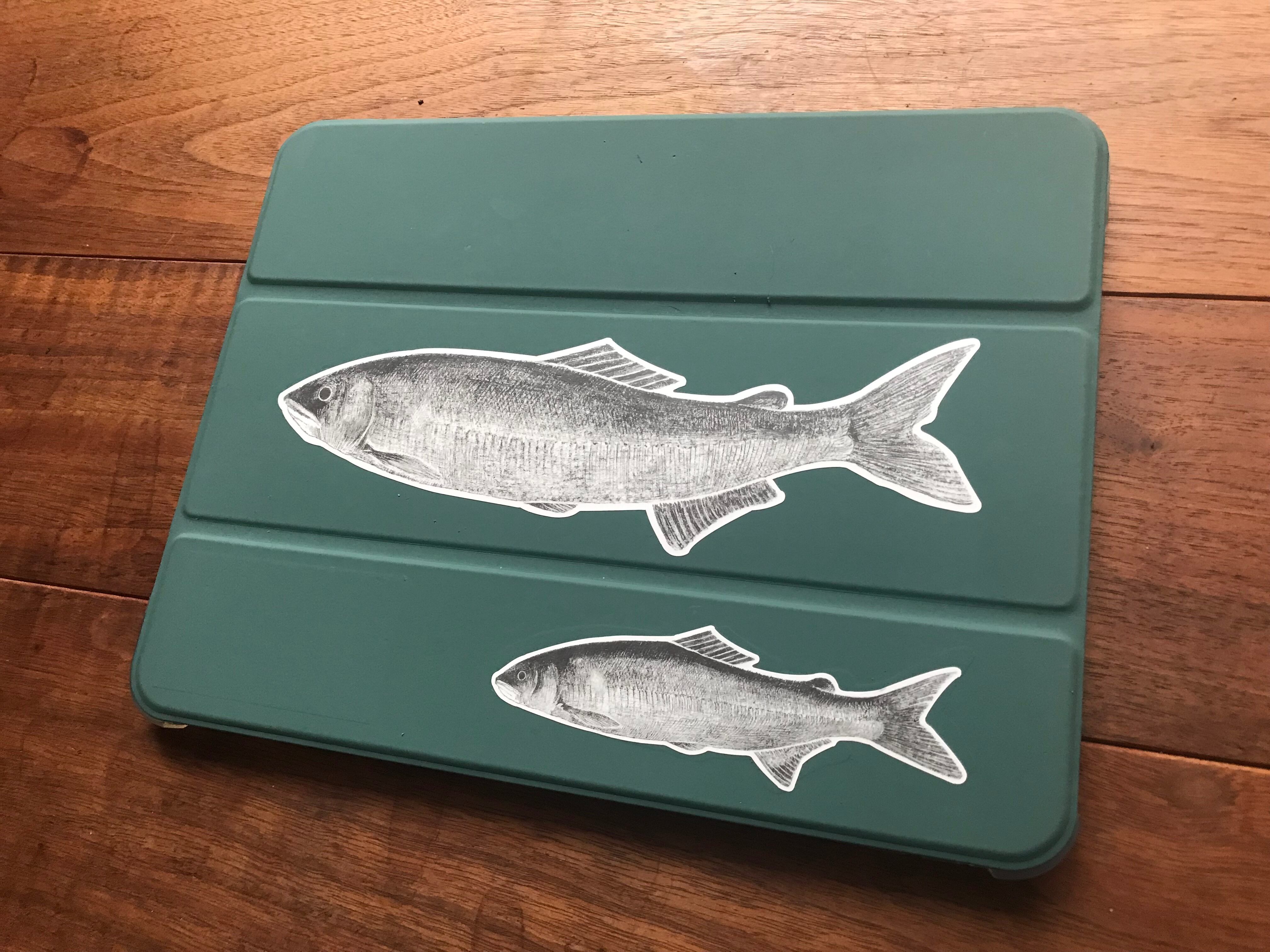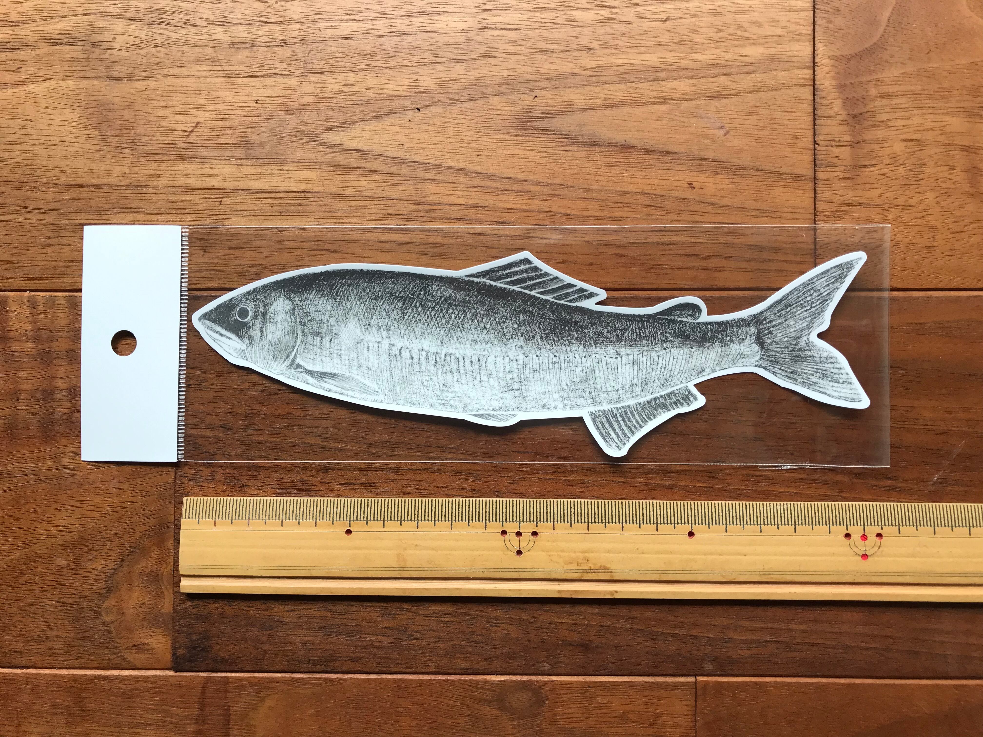 屋外でも使用できるタイプのステッカーです。サイズは約20cm×6cm、鮎の実物大くらいの大きさです。10.9inchのタブレットカバーにちょうど収まる寸法です。